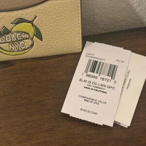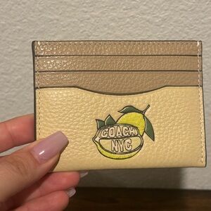 Stylish card holder with Coach NYC lemon design. Features multiple card slots. Compact and chic.
