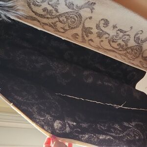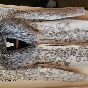 Gorgeous faux fur collar, scrolled design, 100% wool, hook front closure. Perfect for layering!