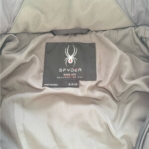 Excellent condition , Spyder women’s down coat. Knee length. Size small. Charcoal grey. Very warm synthetic down coat with a water resistant outer shell. Full zip front closure with an attached hood. Two hand pockets.