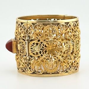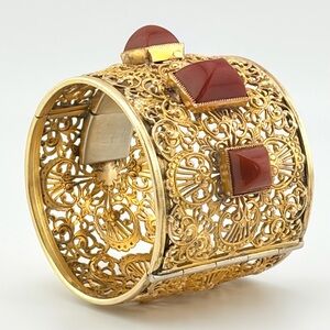 RARE Vintage Napier Gold Plated Brass Filigree Cuff With Carnelian Cabochons.