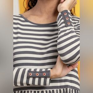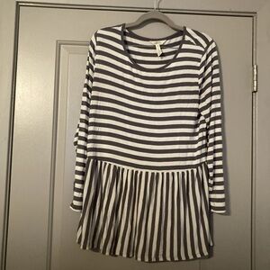Chic peplum top with gray and white stripes. Perfect for casual wear.