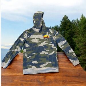 Stylish camouflage hoodie featuring a mountain patch. Perfect for casual wear.