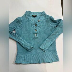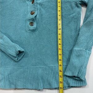 Cozy, classic, and effortlessly cute! This Eddie Bauer knit sweater features a beautiful aqua blue color, a waffle-knit texture, and a flattering button-up V-neck. Finished with wide ribbed cuffs and hem for that perfect fitted look. Great for layering on chilly days or wearing on its own for a casual, timeless style.