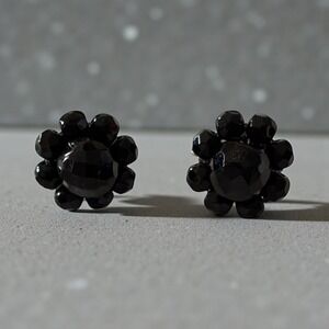 Vintage Black Faceted Cluster Screw Back Earrings Mid Century Glass Floral