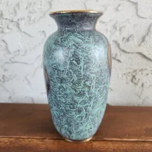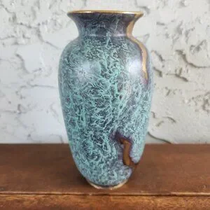 Beautiful vintage Jasba Keramik vase from West Germany, dating to the 1950s. This mid-century ceramic vase stands 6.5 inches or 16 cm tall (form number 500/16) and features the distinctive Jaspatina glaze — a textured mottled turquoise-blue surface with flowing metallic gold accents. Jasba was one of the leading West German pottery makers, prized for their bold glazes and elegant forms.
