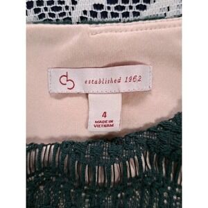 This DB established 1962 dress in a size 4 features a green lace overlay with a tan lining, making it perfect for a party or cocktail occasion. The dress has a boat neck, 3/4 sleeves, and a back zipper for easy wear. The A-Line and Sheath style with a knee-length design adds a classic touch to the dress, while the geometric pattern and crochet accents give it a stylish flair. Made from lace fabric and lined for added comfort, this dress is a versatile option for fall and spring events. Please review all photos carefully for overall condition and measurements before making a purchase to help avoid returns.