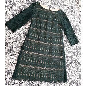 DB established 1962 Dress 4 Green Lace Overlay Tan Lining 3/4 Sleeve Back Zipper