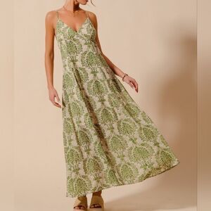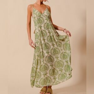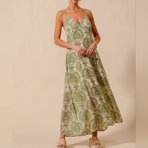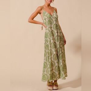 SO ME Damask Floral Summer Maxi Flowy Dress With Open Back In Sage Green sz Lg