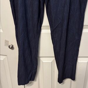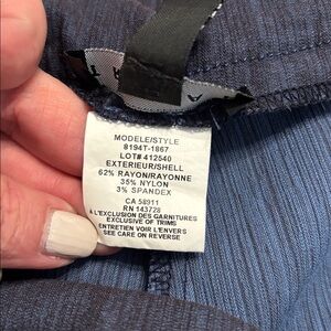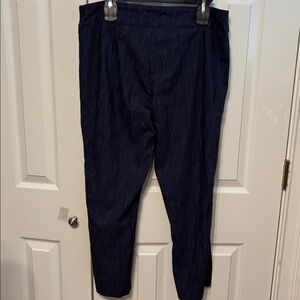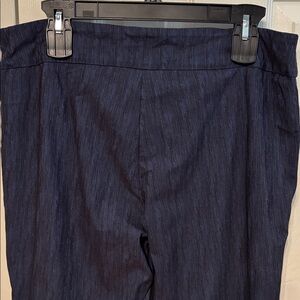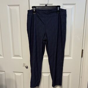 Gently used. Casual pull on pant. Stretchy. Ankle length. Black with a blue abstract striping. Size 14 Color Black/Blue 16” waist, 11” rise & 25” inseam Rayon/Nylon/Spandex
