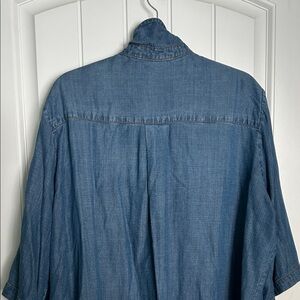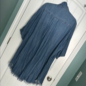 Casual denim shirt jacket with button-up front. Features a relaxed fit and frayed hem for a trendy look.