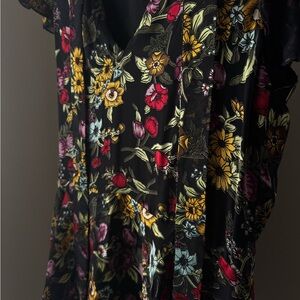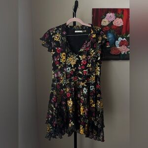 Chic mini dress with colorful floral design. Features ruffled sleeves and layered skirt. Ideal for stylish outings.