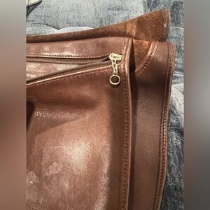 Sophisticated Coach bag in dark brown leather. Features embossed logo. Timeless design. Nice leather bag outside needs some cleaning but really nice the inside is in great condition!