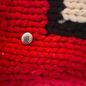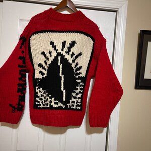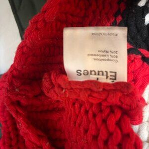 Long sleeve knit wool-blend sweater in red. Intarsia knit graphics and text in black and white throughout. Rib knit crewneck collar, cuffs, and hem. Dropped shoulders. Part of the Etudes x Keith Haring collaboration. Unisex. Excellent condition.