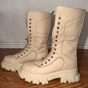 Step out in style with these chic cream lace-up boots. Perfect for any occasion, they offer both comfort and fashion-forward design.