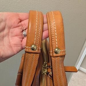 Handles: Dual rolled leather handles with a comfortable drop for hand or arm carry. Includes original matching brass Coach hangtag.
