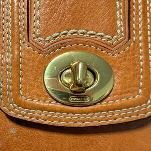 This is an authentic Coach Hamptons satchel crafted from thick, high-quality leather in a rich whiskey/tan hue. This bag features the iconic cream contrast stitching and heavy brass hardware that defined Coach’s mid-2000s "vintage-inspired" aesthetic.