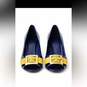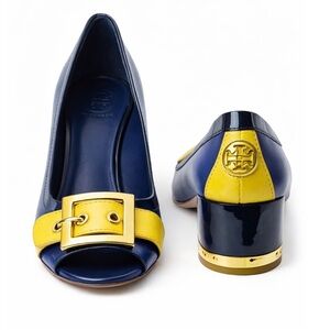 Elevate your look with these stylish Tory Burch pumps featuring a bold blue and yellow colorway with gold-tone hardware. Designed with a comfortable block heel and peep-toe front, these shoes are perfect for both work and special occasions.