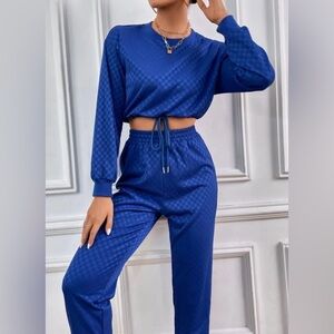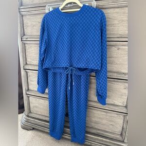 NEW 2 Piece Set Tracksuit NWOT Blue Checkered Cropped Crop Top Joggers Track Pa…