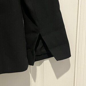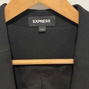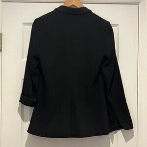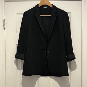 Classic and versatile black blazer by Express, perfect for work or dressing up a casual look. Features a notched lapel, single-button front, and rolled cuff sleeves (which can be unrolled) for a modern, polished vibe. Clean lines and a structured fit make this a wardrobe staple you’ll reach for again and again. Perfect for the office, interviews, business casual outfits, or layering over dresses and tops for a chic everyday look