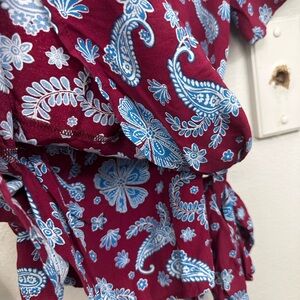 Chic V-neck blouse with floral paisley pattern. Burgundy base with blue accents. Perfect for casual outings. This item is a LOFT red and blue paisley print wrap blouse. The top features a vibrant red background with a detailed blue and white paisley and floral pattern.