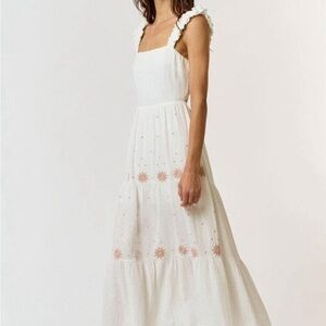 Step out in style with this chic white maxi dress, featuring elegant ruffled straps and delicate floral details. Perfect for any occasion.