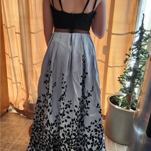 Stylish halter dress with a black top and gray skirt. Features a chic leaf pattern. Ideal for special events.