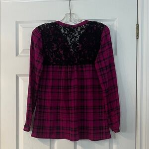 Chic plaid blouse with button-up front. Features vibrant pink and black pattern. Ideal for casual or office wear.