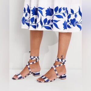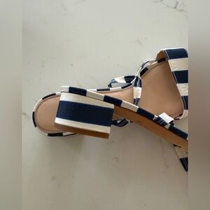 Size 10. Chic striped sandals with ankle tie. About 1” heel.