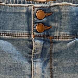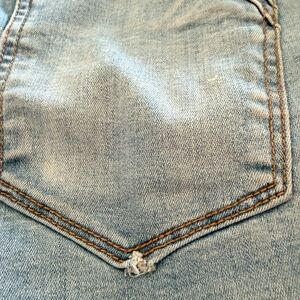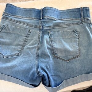 Casual light blue denim shorts. Features classic stitching, cuff, 5 pocket design and stretch waist for a comfortable fit. Slight sign of wear on the back right pocket shown in pic.