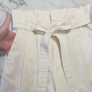 Trendy cream belted paperbag high-rise pants with 4 pockets and wide elastic waistband, size XS. Organic cotton with slight stretch.