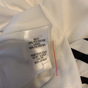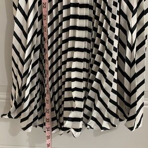 Lightweight pleated woven fabric, with a black and white striped pattern, shapes this cute dress that falls from a modified halter neckline into a flowy shift silhouette and ends at a mini hem. Keyhole opening and button closure at back.