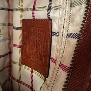 Sophisticated leather shoulder bag by Coach. Rich brown hue. Ideal for daily use. There is a small dark stain (in the third picture, on the exterior leather) along with light scuffs that add to the vintage look. Stitching and hardware are in tact. Please feel free to ask any questions before purchasing.