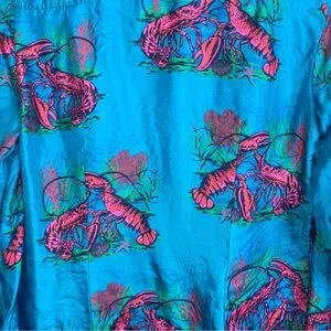 J.Crew Collection Lobster Print Silk Twill Button Down Shirt Size 4 - 100% Silk - button down front collared, button cuff sleeved, vibrant blue with all over lobster print