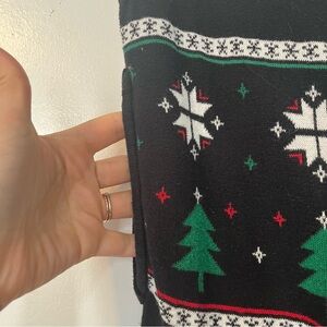 Cozy Christmas joggers. Sweat pants are black with a green white and red reindeer motif with trees. Sweater like material. Fuzzy and some wash wear but overall good condition.
