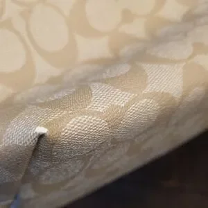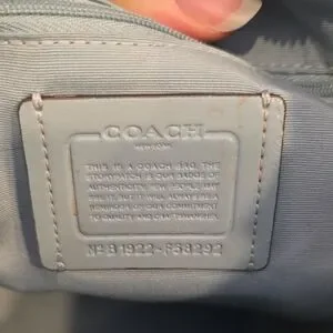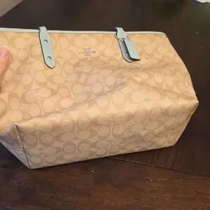 Stylish Coach tote with signature pattern. Light blue accents add a fresh touch. Comes with matching wallet. Perfect for daily use. Slight wear on corners.
