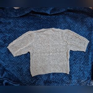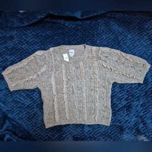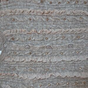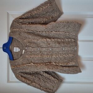 NWT Anthropologie Maeve short sleeve embellished ruffle cardigan sweater in Taupe. Cable knit. This sweater has such amazing details: rhinestone buttons, ruffles, and embellishments. Retails for $148 Canadian + Tax + Duty. I've included the size chart from Anthropologie as a guide. Approx measurements in photos (approx. because cardigan has ruffles and doesn't lie flat).