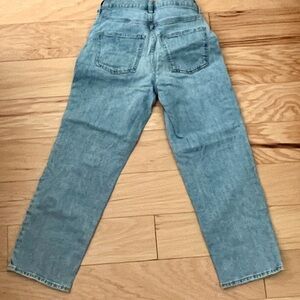 Stylish distressed women's jeans in a classic blue shade. Perfect for a casual, trendy look. Size 0/25R. Closes with buttons for a classy look. Straight fit, fair trade, 98% cotton.