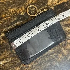 Black Michael Kors jet set coin pouch. Two credit card slots. One drivers license slot. One slot on side. Zippered coin pouch.