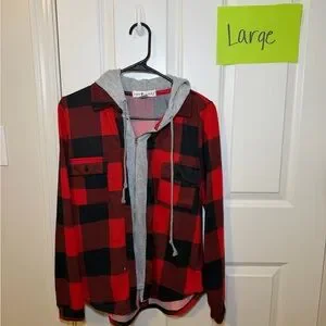 Bold checkered jacket with a soft gray hood. Button front and chest pockets. Ideal for layering.