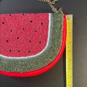 Unique watermelon-themed beaded longer strap/crossbody purse by LULU. Featuring vibrant red and green colours and a chain strap, it's perfect for a playful look!