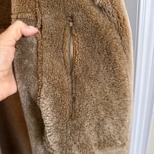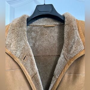 Stylish brown shearling coat with cozy lining. Perfect for cold weather.