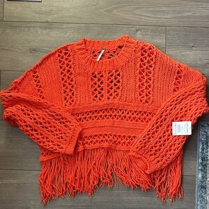 Bright orange knit with fringe hem. Intricate open-knit design. Perfect for a bold look.