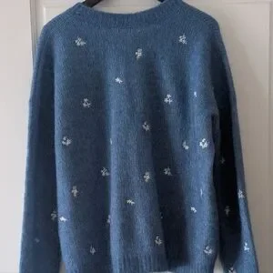 Cozy blue sweater featuring a delicate white floral pattern. Worn once and received a lot of compliments. Comes from a smoke free home.