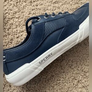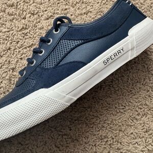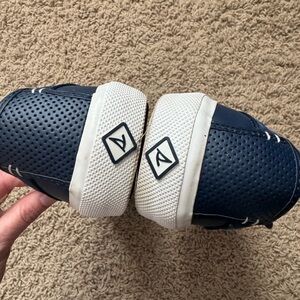 Classic Sperry boat shoes in dark blue. Features durable laces and comfortable sole. Very good condition showing little signs of wear. Size 9 1/2. Smoke free home.