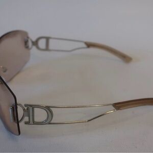 Elegant Dior sunglasses in silver accents. Rimless design for a modern look. Includes protective Dior case. In good vintage pre-loved condition.