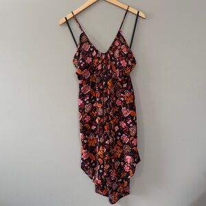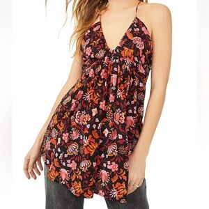 Free People Pixie Cross Tie Back Floral Flowy Tunic Top Mini Dress Size XL Black Pink Yellow Red Orange