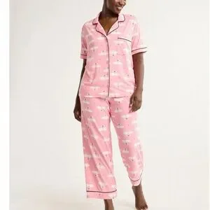 Joyspun Women's Dreamy Soft Collection Notch Top and Pants Pajama Set pink with a white swan pattern. The set features a notch-collar, short-sleeve top and matching Capri pull-on pants with pockets , both accented with contrast black piping.