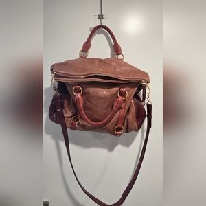 Rare find and it great shape. Classic 2way shoulder and hand bag with gold accents. Minimal wear on edges. Really 3 colors- old rose, slightly darker pink on handles with burgundy sides. Very rare color combo- so cool.