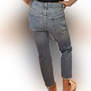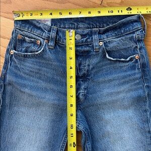 This is a pair of button button fly gap cheeky straight high-rise jeans in a size 26/2 petite. The color of the jeans is best represented in the photo I have of the pants unbuttoned. I am modeling it in the photos and I am approximately 5'3" tall. It's in great condition. Only selling because I have way too many genes. It is made out of 99% cotton and 1% spandex. The inseam is approximately 23.5" and the front rise is approximately 10 inches. Inventory box 2.