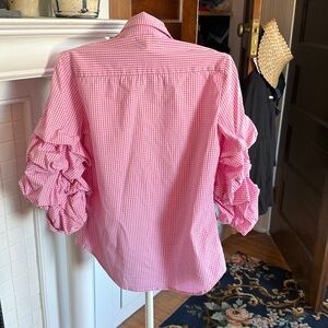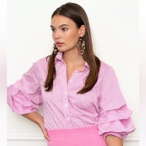 Elevate your style with this chic pink gingham blouse featuring elegant ruffle sleeves. Perfect for any occasion.